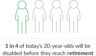 Most people don't think they're at risk of becoming disabled, but according to the U.S. Social Security Administration, one in five Americans (56 million) are currently living with a physical or mental disability. Additionally, it's estimated that one in four of today's 20-year-olds will become disabled before reaching their retirement age.